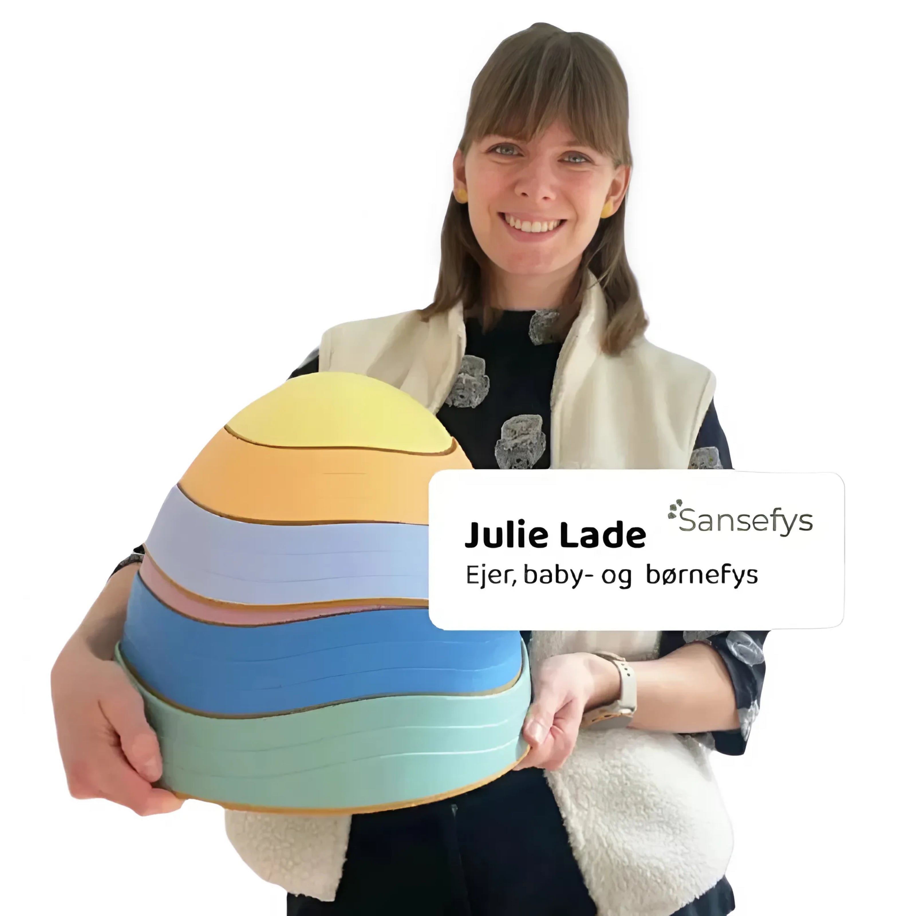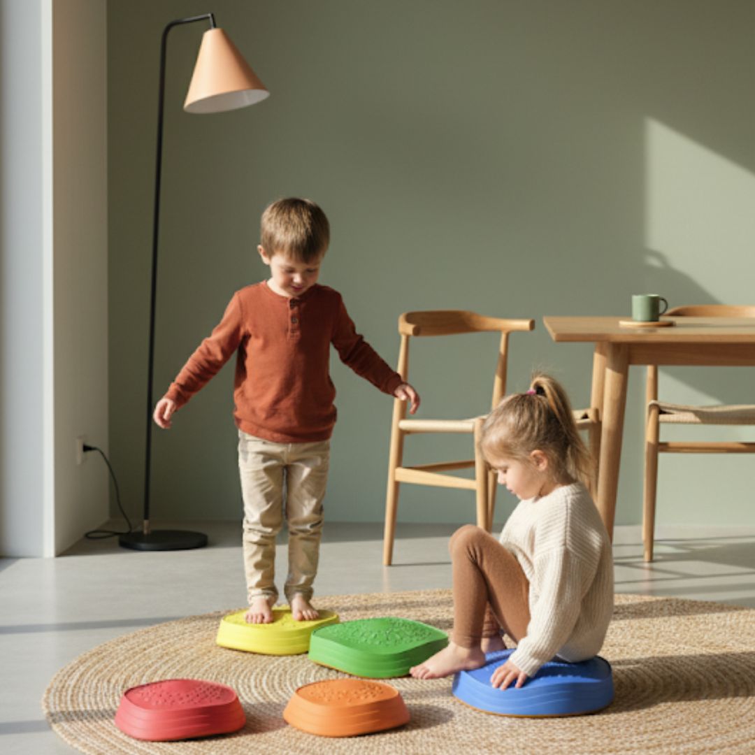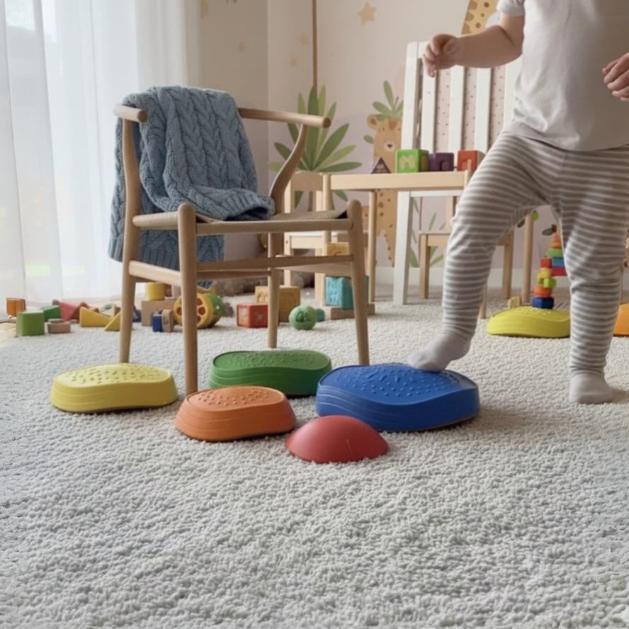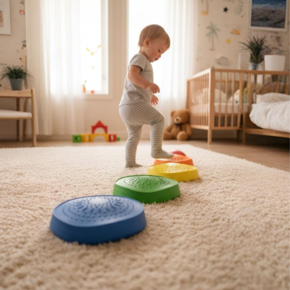 "Taktilsansen, muskel- og ledsansen bliver sat i spil, når man leger med tumlestenene. De træner aktivering af de små, lednære muskler omkring ankel, knæ og hofte, som skaber stabilitet."