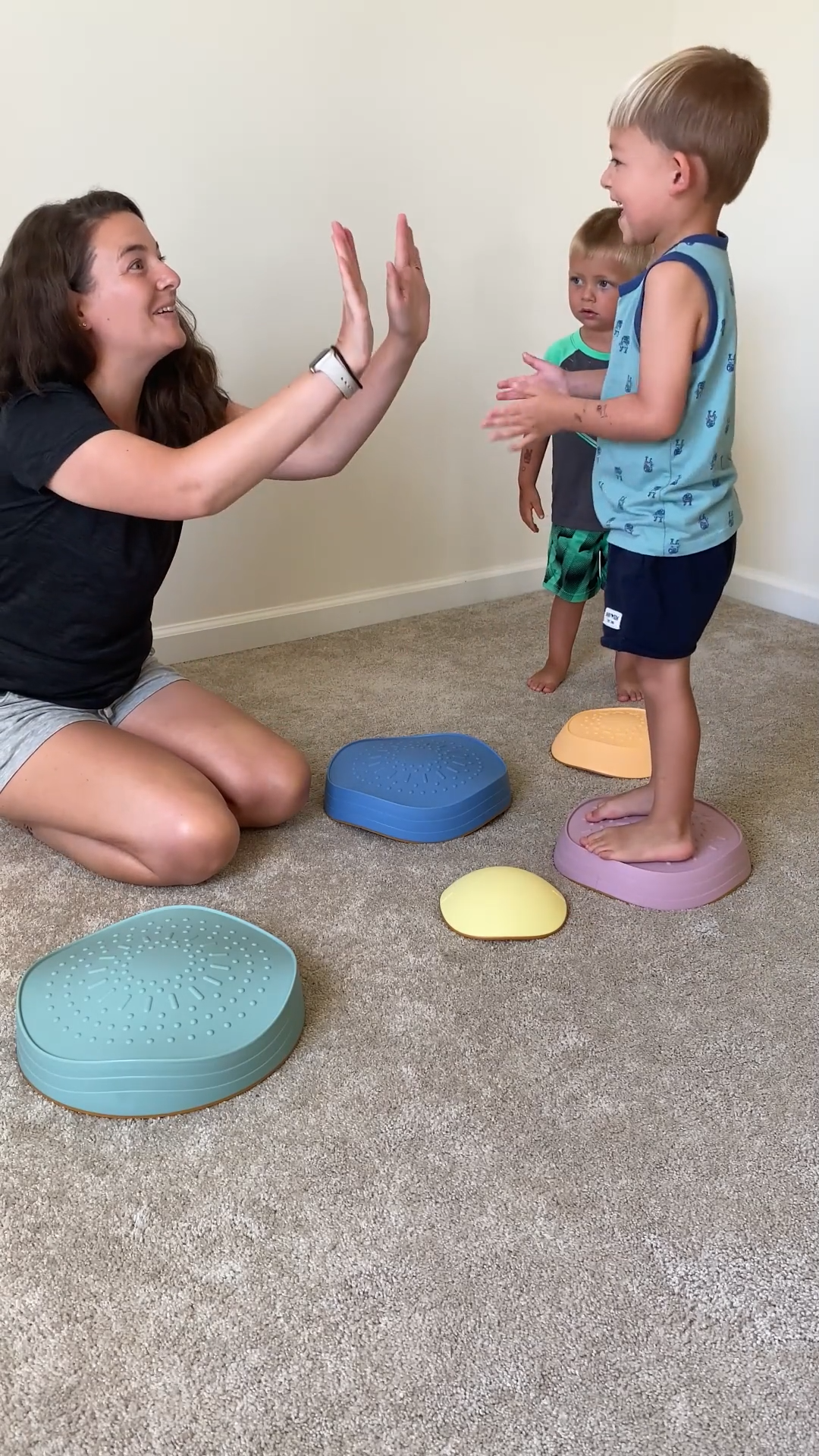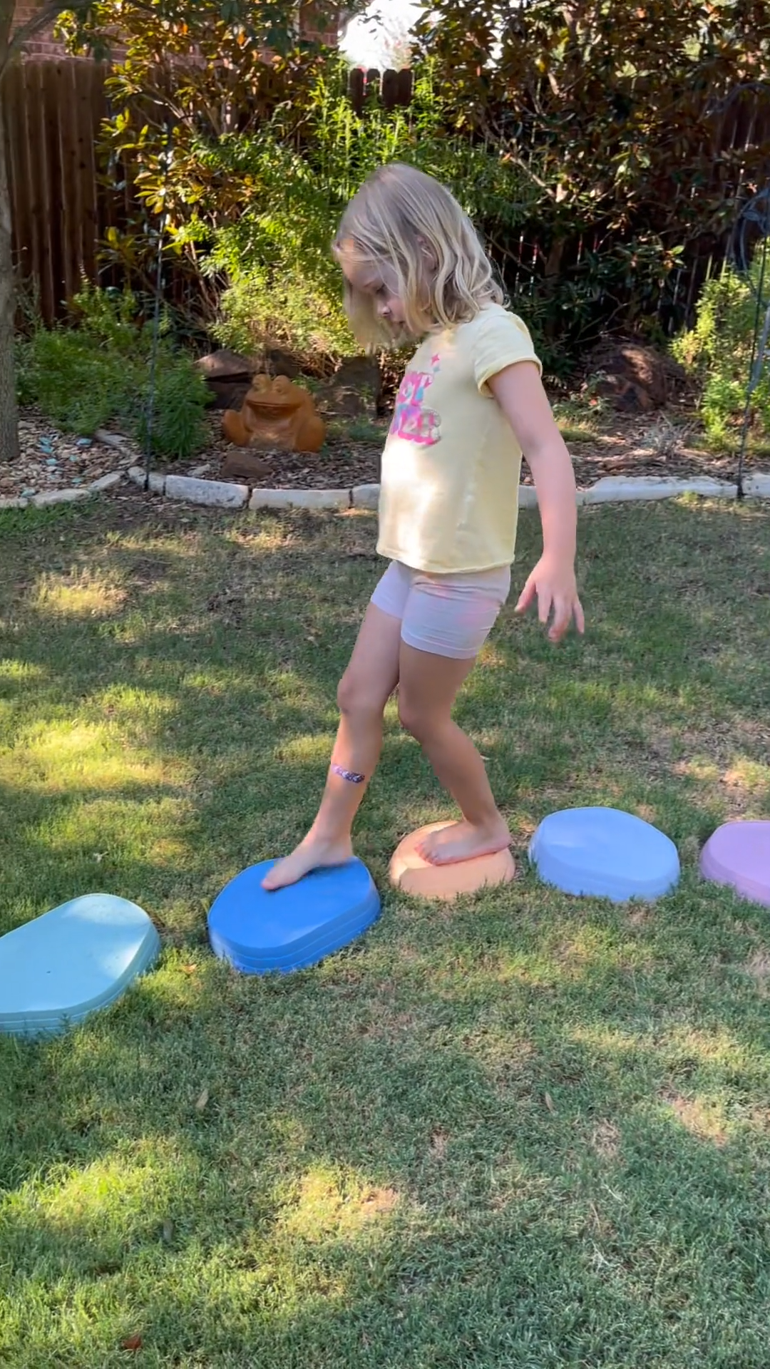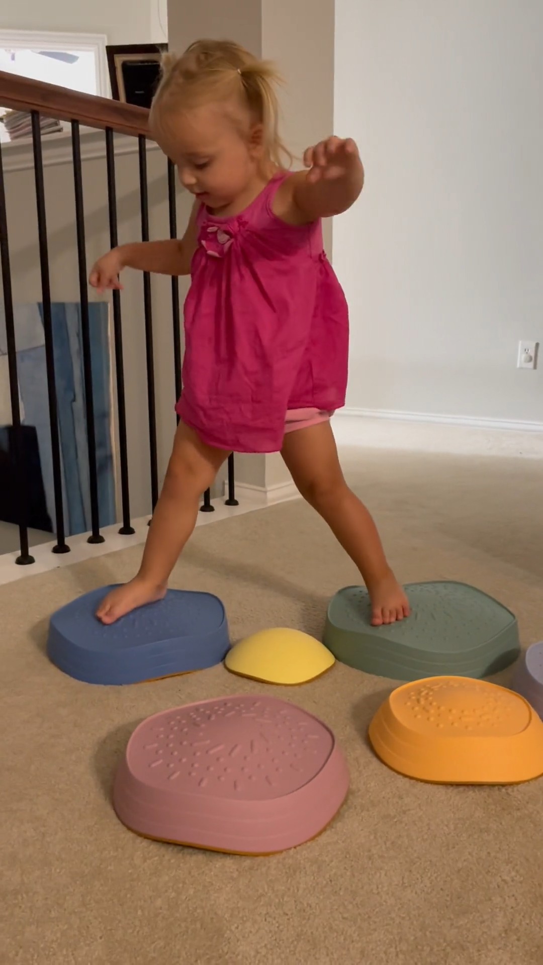 "Taktilsansen, muskel- og ledsansen bliver sat i spil, når man leger med tumlestenene. De træner aktivering af de små, lednære muskler omkring ankel, knæ og hofte, som skaber stabilitet."